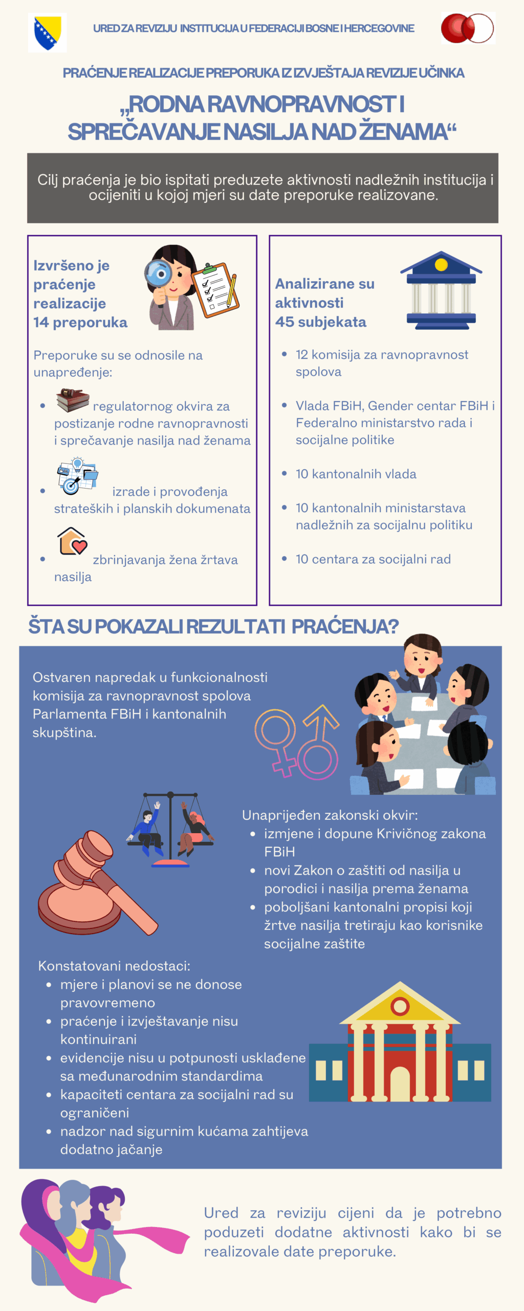 Ured za reviziju institucija u Federaciji Bosne i Hercegovine proveo je praćenje realizacije preporuka iz Izvještaja revizije učinka „Rodna ravnopravnost i sprečavanje nasilja nad ženama“, objavljenog 2023. godine.